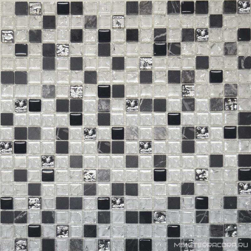 Мозаика Мастера Керамики Glass & Stone Мозаика Glass & Stone 2026 микс мрамор черный-черный-белый кол-платина (чип 15х15мм) ZZ|30x30