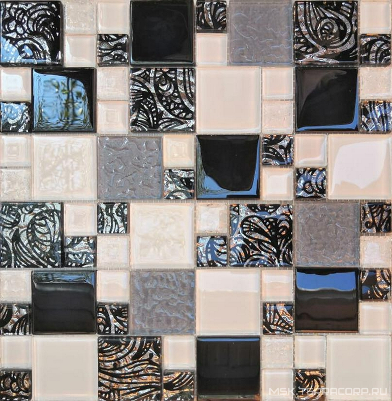 Мозаика Мастера Керамики Glass Мозаика 2171 микс белый-белыйколотый-темно-серый-серый риф.верх-платина с черным рис 48х48/23х23 ZZ|30x30