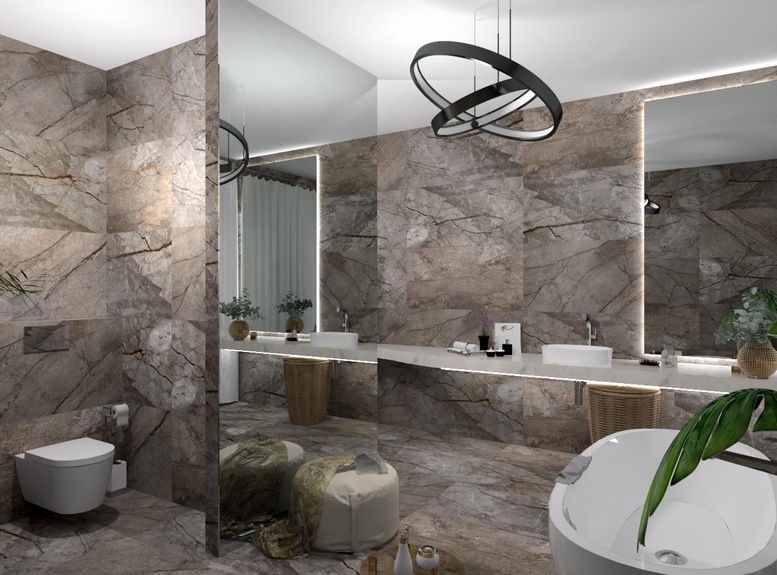 Большая ванная комната совмещенная с санузлом и душевой в современном стиле