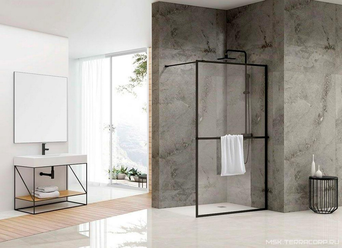 Душевая перегородка 900хh2000мм, правая/левая, (стекло прозр.6мм, поперечн. укорачиваемый кронштейн 660-1200мм, фурнит. цв.черный мат), Immer Offen ZZ