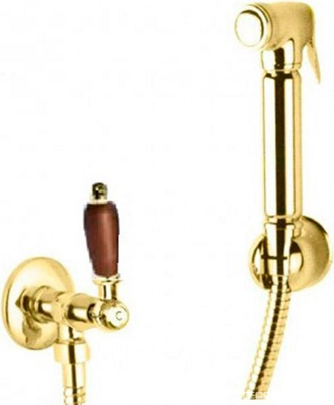 Гигиенический душ со шлангом 120см, запорным вентилем и держателем, (цв.золото, ручка цв.орех), ZZ Cezares First FIRST-KS-03/24-Nc