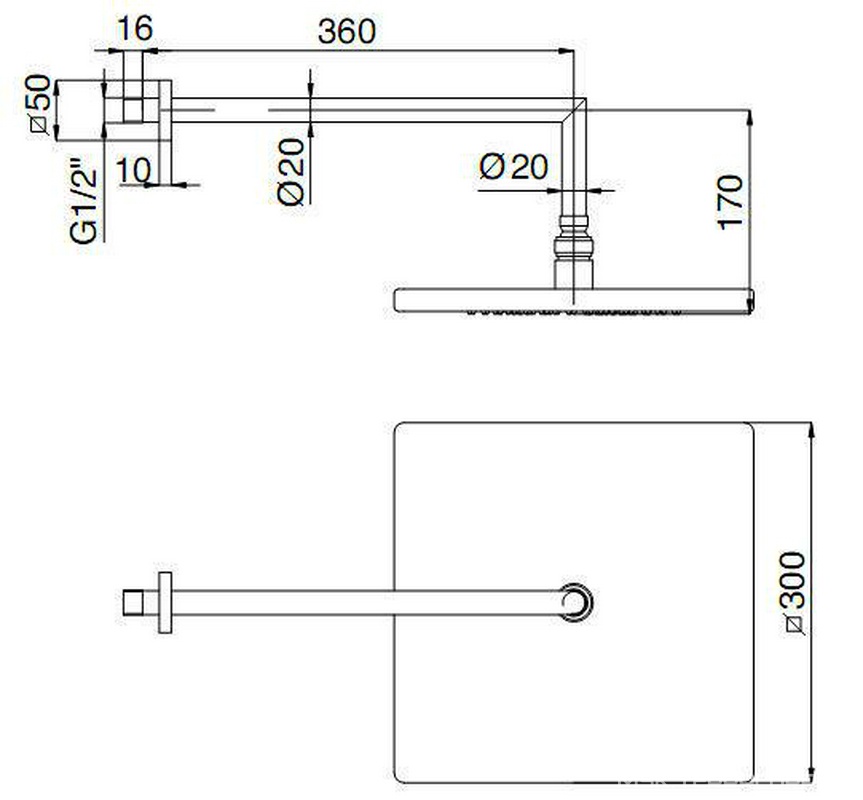 Верхний душ 3M Showers Душ верхний, стационарный, лейка квадратная 300мм, стеновой кронштейн 360мм, G1/2, декор. накладка в компл., (цв. хром), Quadra / X-Change 3М ZZ