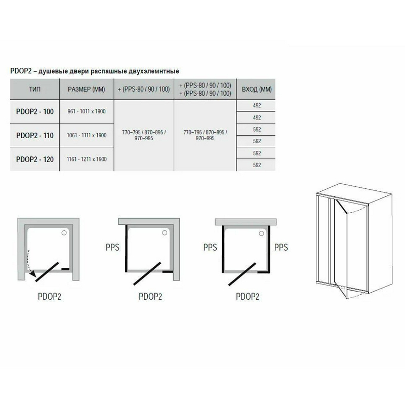 Душевая дверь Ravak PDOP2 Душевые двери PDOP2-120, двухэлементные, стекло прозрачное, профиль - сатин, с установочным комплектом ZZ