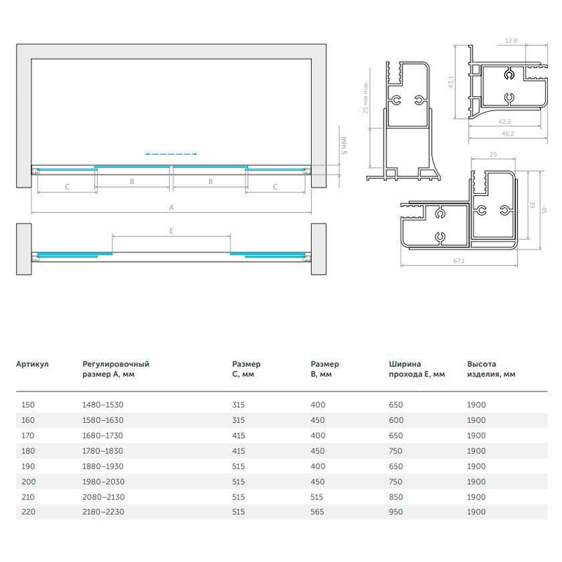 Душевая дверь Vegas Glass Z2P Дверь в нишу Z2P TUR NOVO h1900, 200x190 см, двухстворчатая раздвижная, профиль хром глянец, стекло прозрачное, покрытие BriteGuard ZZ