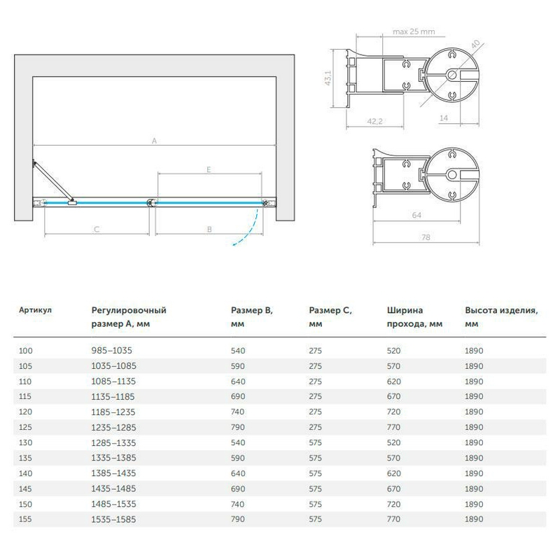 Душевая дверь Vegas Glass EP-F-1 Дверь одностворчатая распашная, с неподвижным элементом в нишу EP-F-1, 150*190 см, левая, профиль глянцевый хром, стекло сатин, ZZ