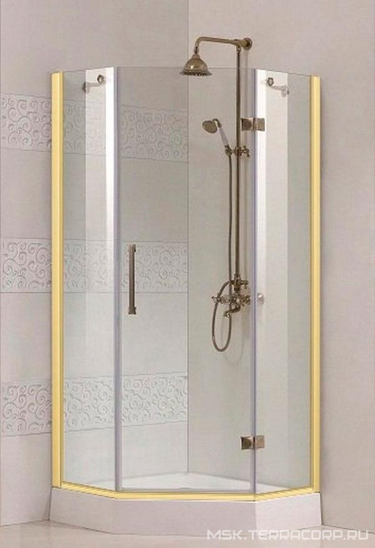 Душевое ограждение Cezares Magic Душ. уголок 900х900хh1950мм, пятиугольный, расп.дверь петли справа, с 2-мя неподв.сегм., вход 595мм, (стекло прозр., 8мм, фурн. цв.золото), Magic ZZ