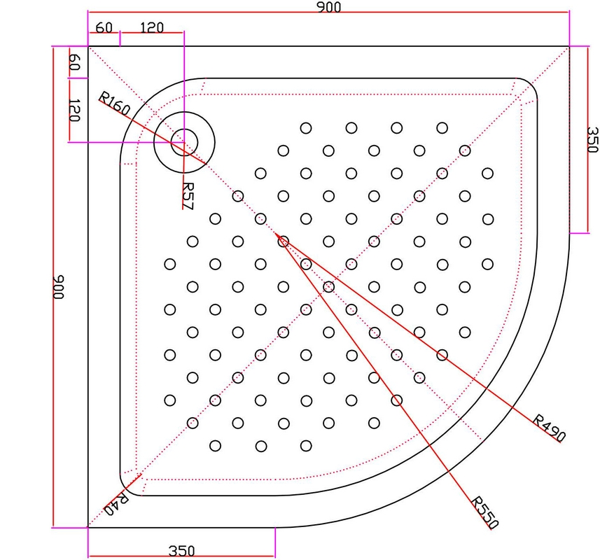 Душевой поддон Cezares Универсал Поддон душевой 900х900h150мм, 1/4 круга, R550мм, отв. слива 90мм, (сифон крышка цв.хром, мет каркас, ножки в компл.), акрил цв.белый, Cezares KL