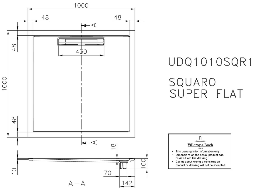 Душевой поддон Villeroy & Boch Squaro Поддон д/душа прямоуг.1000х1000хh18/100мм, сифон в комплекте, ножки, опора, уплотнитель в компл., (кварил, цв.белый глянц.), Squaro ZZ