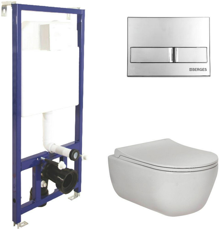 Инсталляция и кнопка для унитазов Berges Ego Комплект : инсталляция для подвес. унитаза + кнопка хром "L3" + подвес. безободковый унитаз с сиденьем микрл. ZZ