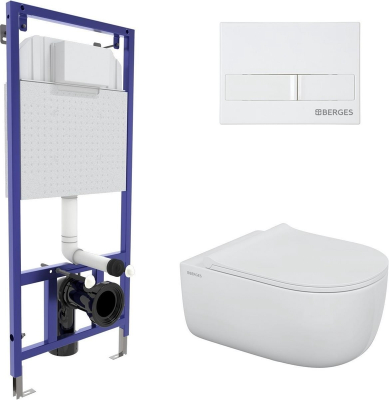Инсталляция и кнопка для унитазов Berges Универсал Сет инсталляция NOVUM525, кнопка L1 белая, унитаз EGO XL Rimless, сиденье дюропласт Okus Slim SO, микролифт, ZZ