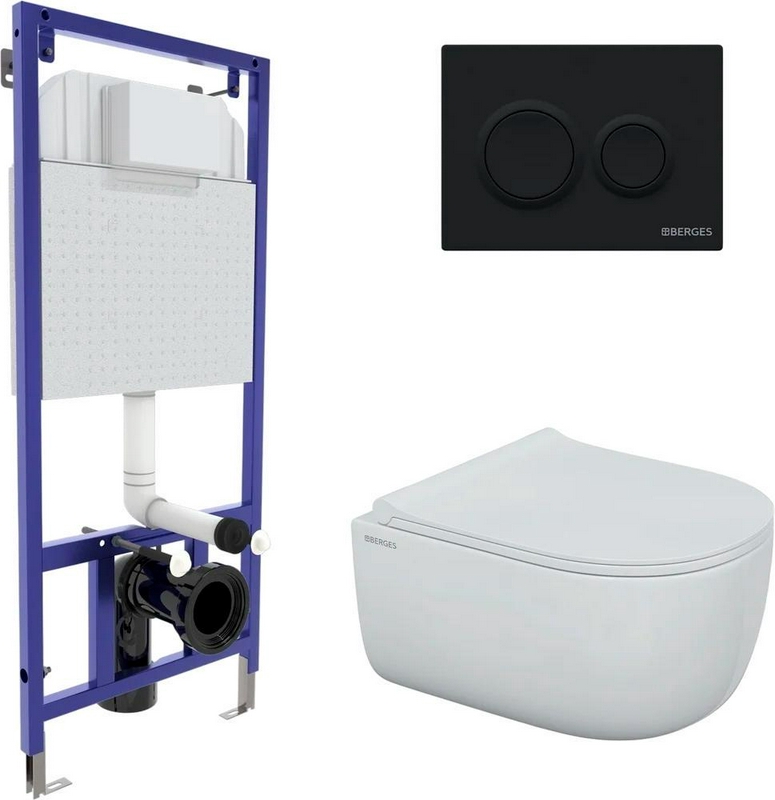 Инсталляция и кнопка для унитазов Berges Универсал Комплект : инсталляция для подвесного унитаза+ клавиша цв.черный+ подвесной унитаз безободковый с сиденьем микролифт ZZ