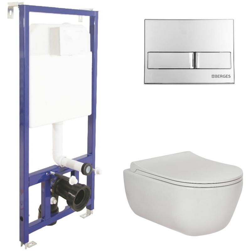 Инсталляция и кнопка для унитазов Berges Универсал Комплект : инсталляция для подвесного унитаза+ клавиша цв.хром глчнец+ подвесной унитаз безободковый с сиденьем микролифт ZZ