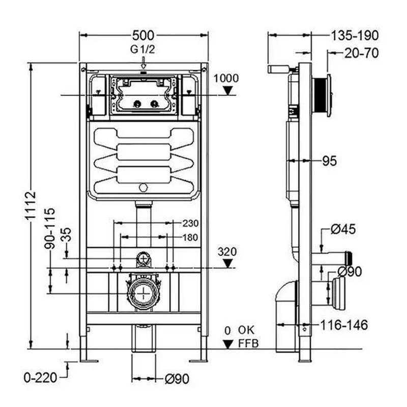 Инсталляция и кнопка для унитазов Urbatec Универсал Инсталляция для подвесного унитаза, 500х135хh1120мм, со смывным бачком скрытого монтажа, фронт.управл., крепёж в компл., без клавиши смыва, Urbatec ZZ