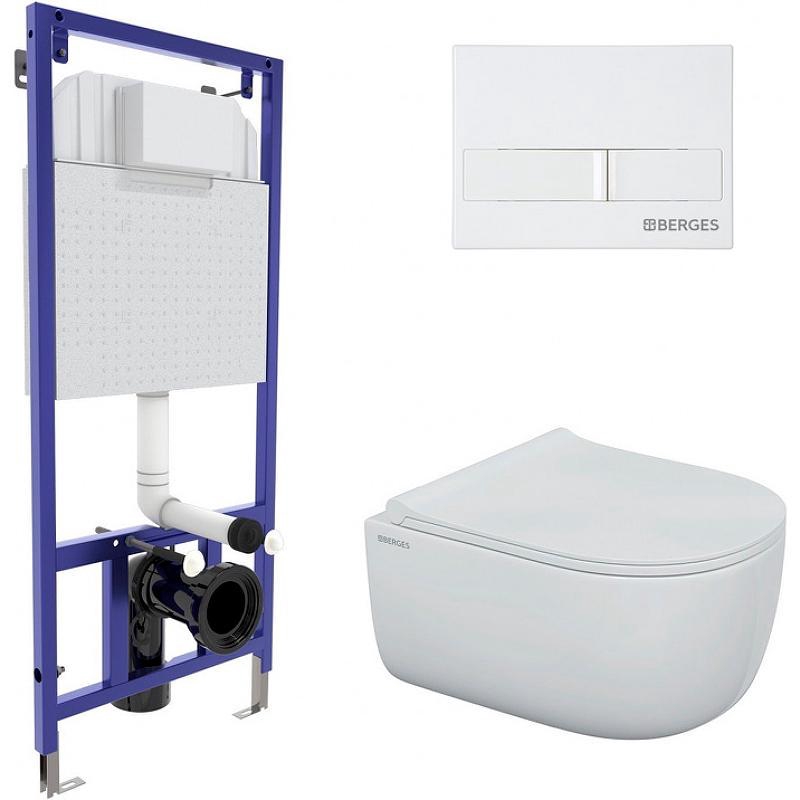 Инсталляция и кнопка для унитазов Berges Vita Комплект : инсталляция NOVUM для подвесного унитаза+ клавиша O1 белая глянец+ подвесной унитаз, безободковый, с сиденьем микролифт ZZ