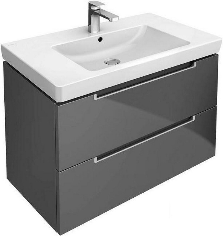 Тумба Villeroy & Boch Subway 2.0 Тумба 787хh520х449мм, для раковины 800мм,(2 выдв.отдел., 3 контейн.д/акс., 4 алюм.штанги, 2стекл.перег., креп.в ком.,(цв. FP серый глянц), Subway 2.0
