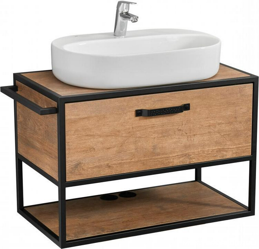 Тумба под раковину подвесная с 1 выдвиж ящиком, столешница пластик, 90х55,5хh54см, без раковины, (цв.дерево/черный матовый), Steal ZZ