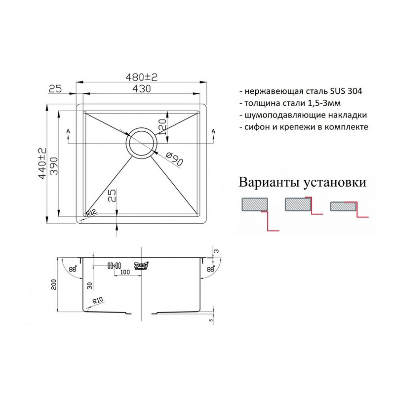 Мойка кухонная встраиваемая cнизу Zorg inox pvd Мойка кухонная Zorg Inox PVD 4844 grafit| 44x48x20