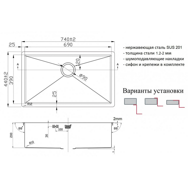 Мойка кухонная встраиваемая cнизу Zorg light Мойка кухонная Zorg Light ZL R 740440 GRAFIT| 44x74x20