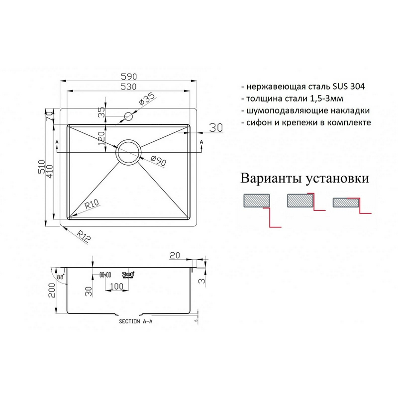 Мойка кухонная встраиваемая cнизу Zorg inox pvd Мойка кухонная Zorg Inox PVD 5951 grafit| 51x59x20