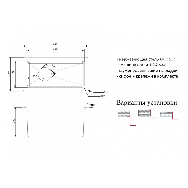 Мойка кухонная встраиваемая cнизу Zorg light Мойка кухонная Zorg Light ZL R 230440 GRAFIT| 44x23x20