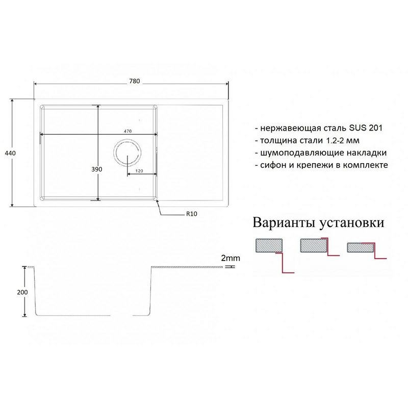 Мойка кухонная встраиваемая cнизу Zorg light Мойка кухонная Zorg Light ZL R 780440 GRAFIT| 44x78x20