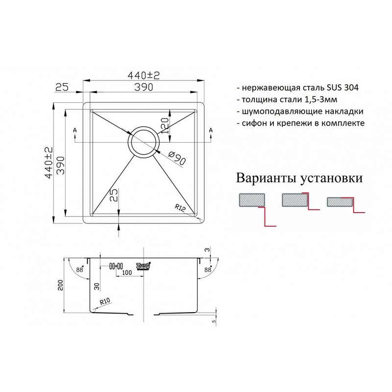 Мойка кухонная встраиваемая cнизу Zorg inox r Мойка кухонная Zorg Inox R 4444| 44x44x20