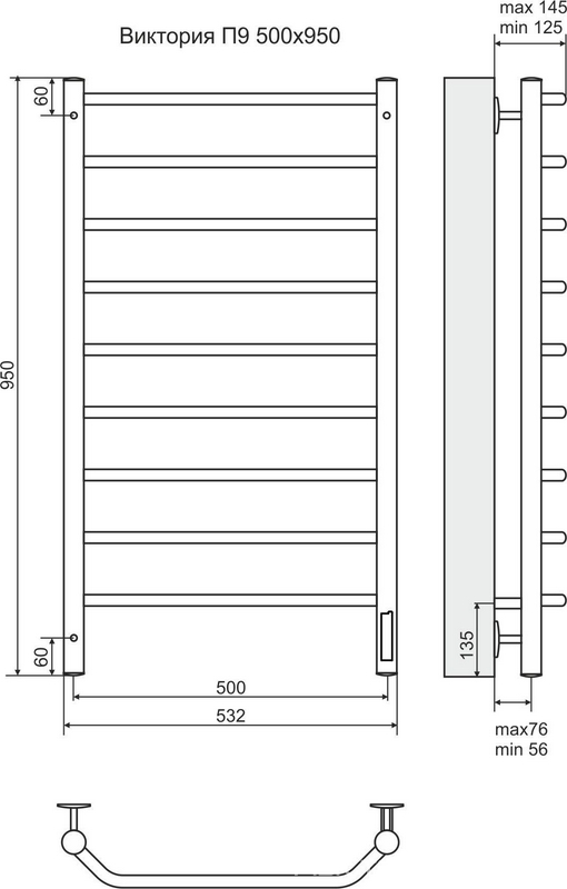 Полотенцесушитель электрический Terminus Виктория Полотенцесушитель электрический "Виктория" 500*930 мм/ П9, поворотный терморегулятор, установочный набор в комплекте ZZ