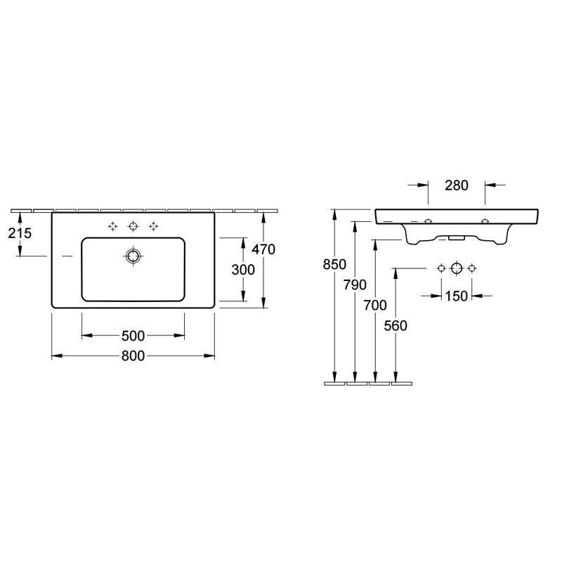 Раковина накладная Villeroy & Boch Subway 2.0 Раковина 800х470мм, c 1 отв. д/смес., с переливом, для установки с мебелью и п/пьедесталом, (цв. 01 white), Subway 2.0