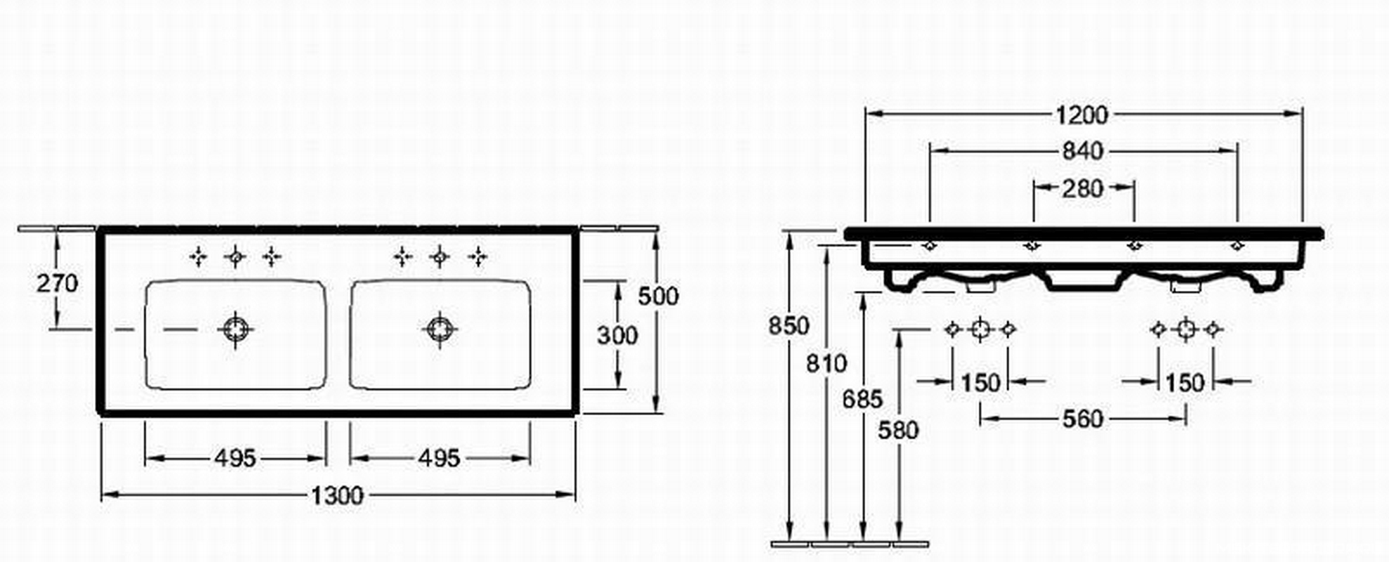 Раковина накладная Villeroy & Boch Venticello Раковина 1300х500мм, двойная, 2 отв. д/смес., с переливом, для установки с мебелью, (цв. 01 white), Venticello ZZ