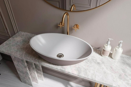 Раковина накладная Holbi Dione Раковина накладная 590х355х165мм, без отверст. для смесит., без перелива, д/к в цвет раковины в компл.,(иск.камень Soft rock цв.белый мат), Dione ZZ