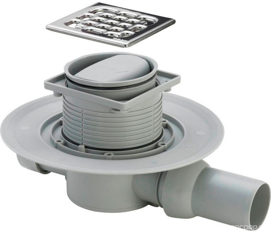 Дренажные канал, трапы Viega Универсал Трап с "Сухим" затвором, h=75мм, выход вбок DN 50мм, 0,45л/с, (пластик цв. серый), решетка из нерж.стали, рамка метал., 100х100мм, в компл., Viega ZZ