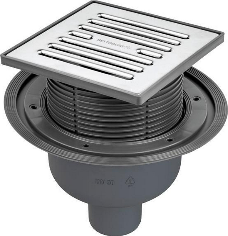 Дренажные канал, трапы Bettoserb Универсал Трап для душа, выпуск в пол d50мм, гидрозатвор сухой/мокрый, решетка нерж сталь 150х150мм, Bettoserb ZZ