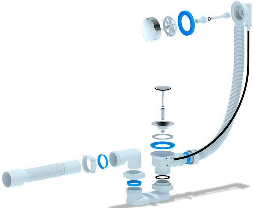 Сифон Ани Пласт Комплектующие Сифон для ванны полуавтомат, плоский, с переливом, гофра в компл.