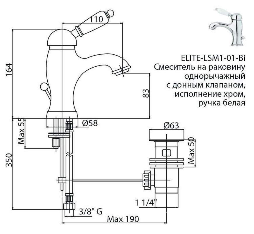Смеситель для раковины Cezares Elite Смеситель для раковины, с д/к, (цв.хром, ручка цв.белый), Elite ZZ