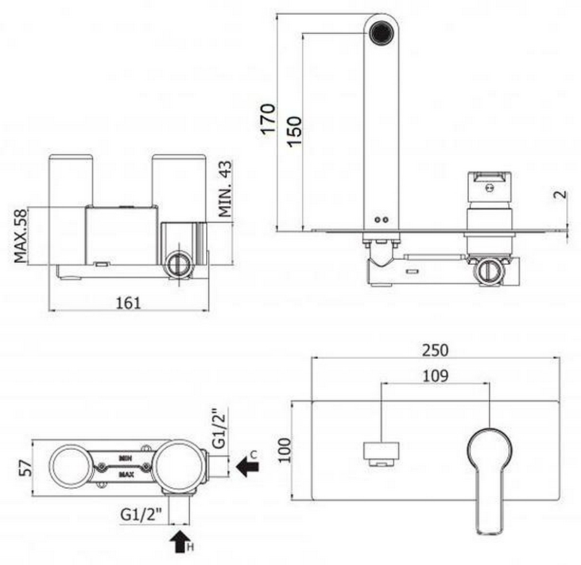 Смеситель для раковины Cezares Ovest Смеситель для раковины настенный, излив 150мм, (внутр.часть в компл.), (цв.хром), Ovest ZZ