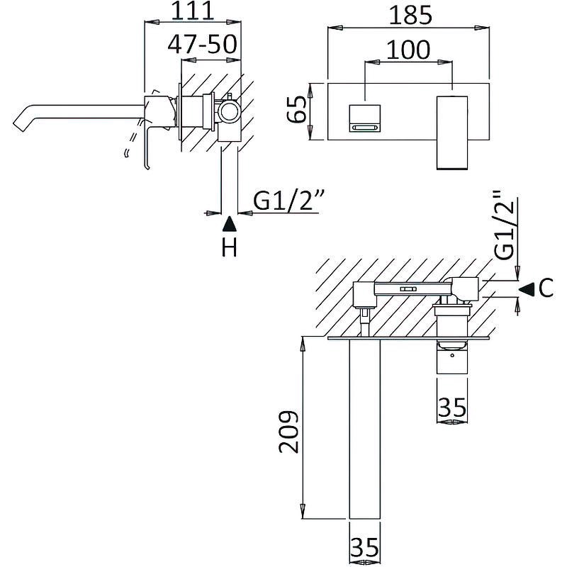 Смеситель для раковины Cezares Porta Смеситель для раковины настенный, излив 209мм, с д/к, (внутр.часть в компл.), (цв.черный матовый), Porta ZZ