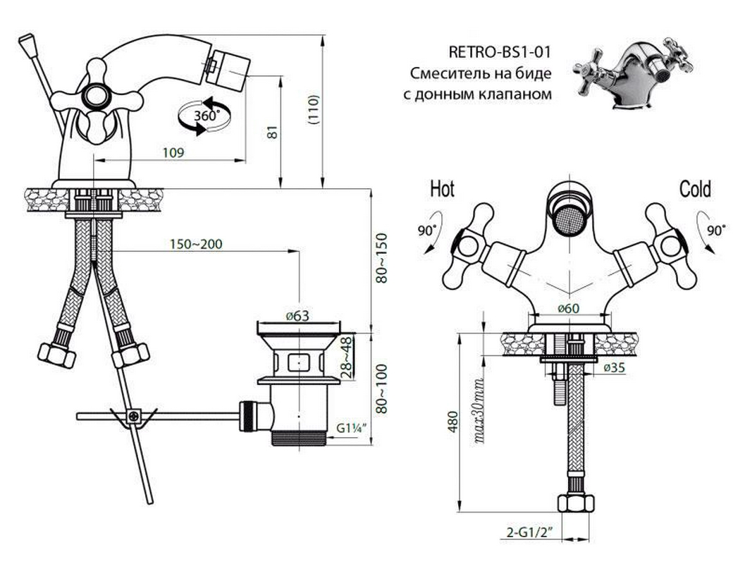 Смеситель для раковины Cezares Retro Смеситель для раковины, с поворотным изливом, с нажимной пробкой д/к, (цв. бронза), Retro ZZ