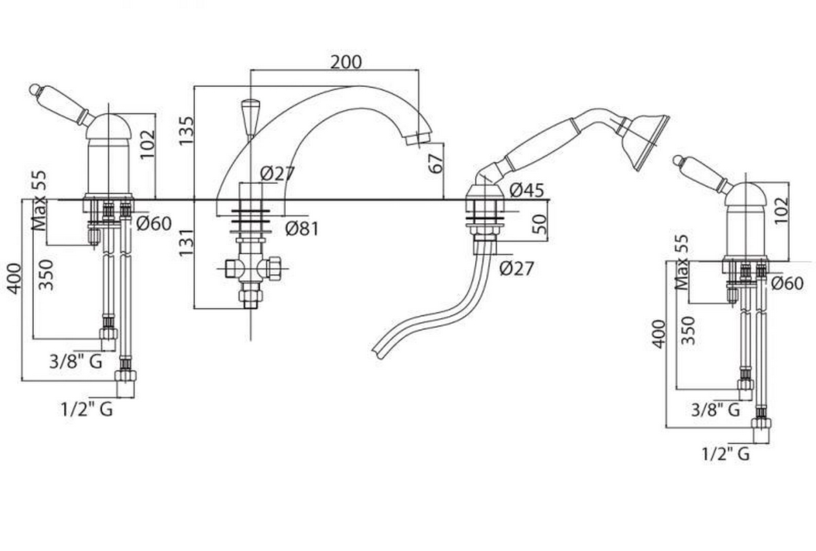 Смеситель для ванный Cezares Elite Смеситель для ванны встраиваемый в борт на 3 отв., с душевым гарнитуром (лейка, шланг), (цв.хром, ручка цв.белый), Elite ZZ