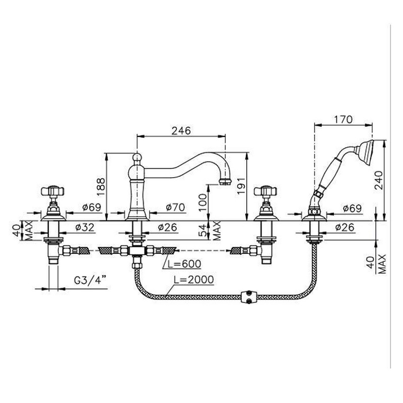 Смеситель для ванный Nicolazzi Tradizionale Смеситель для ванны, встраиваемый на 4 отв., (цв.гальван.золото, ручки Half Dome), Nicolazzi ZZ