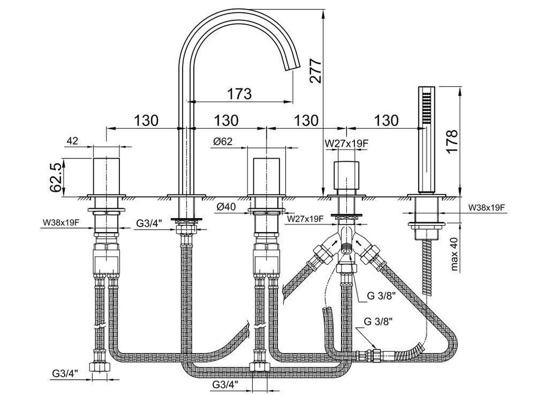 Смеситель для ванный Fantini Venezia Смеситель для ванны, встраиваемый в борт на 5 отв., БЕЗ РУЧЕК, (цв. хром), Venezia ZZ