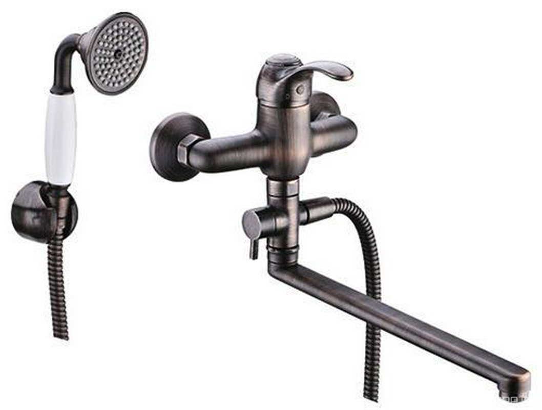 Смеситель для ванны/душа, длинный излив 350 мм, с установочным комплектом, аксессуарами, бронза XX