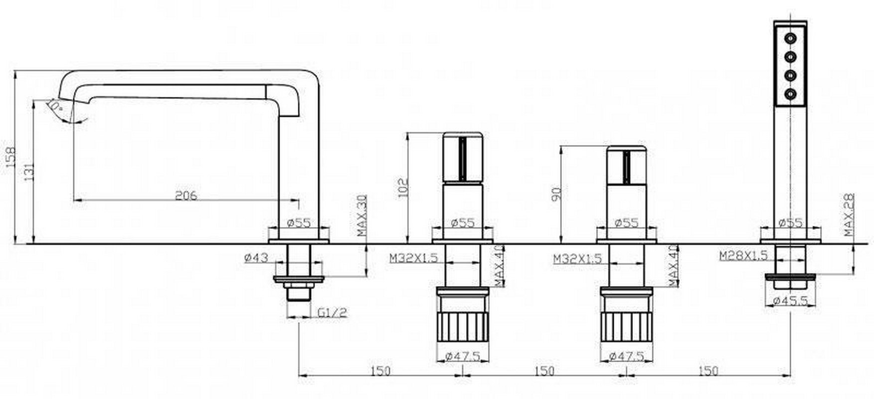 Смеситель для ванный BelBagno UNO Смеситель для ванны, встраиваемый в борт, на 4 отверстия, с душ.гарнитуром, (цв.хром), Uno ZZ