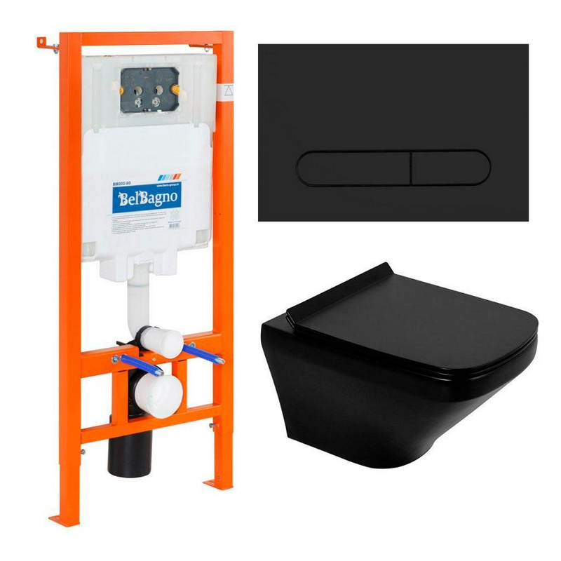 Инсталляция BelBagno Sela Комплект: унитаз подвесной безободковый, сиденье с микролифтом, инсталляция для подв.унитаза, крепёж, клавиша смыва, цв.черный матовый, Sela ZZ