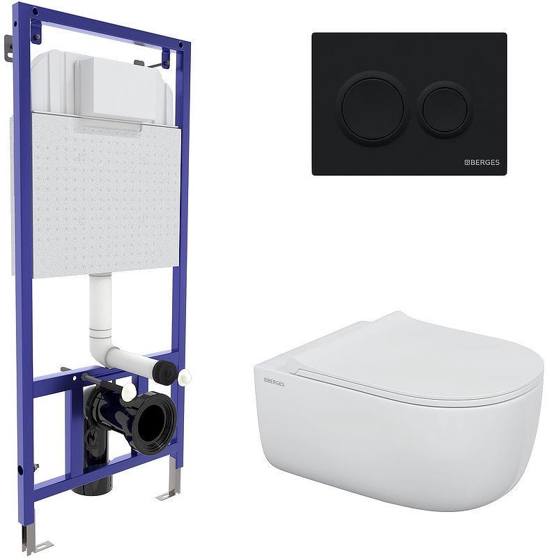 Инсталляция Berges Универсал Комплект: Унитаз подвесной EGO XL Rimless + сиденье с микролифтом Okus Slim SO цв.белый+ инсталляция NOVUM525 + клавиша O5 черная, ZZ