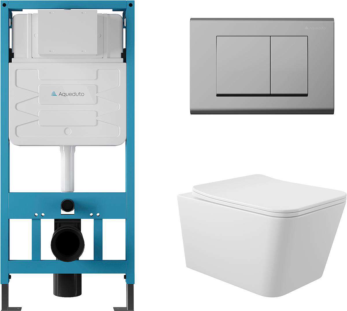 Инсталляция Aqueduto Macio Компл.: унитаз подвесн.,безободк.,520х370мм,цв.белый глянц., сиденье с микролиф,,инстал. д/унит., крепёж, клавиша смыва Quadrado цв.хром, Macio ZZ