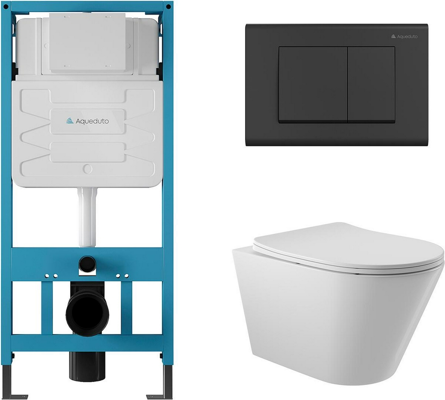 Компл.: унитаз подвесн.,безободк.,525х360мм,цв.белый глянц., сиденье с микролиф,,инстал. д/унит., крепёж, клавиша смыва Quadrado цв.черный мат, ZZ Aqueduto Cone AQDS014