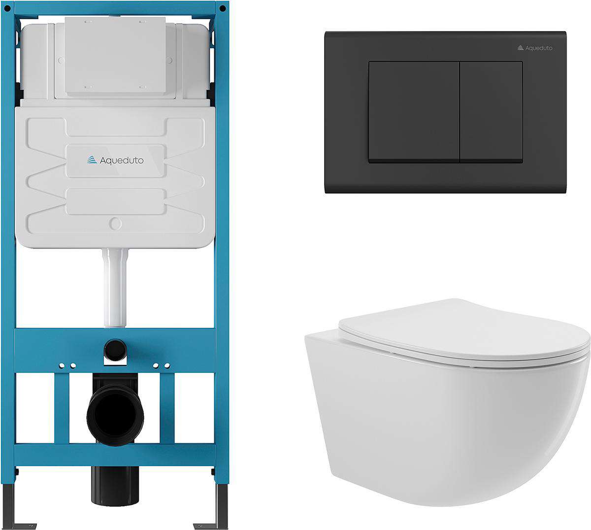 Инсталляция Aqueduto Ovo Компл.: унитаз подвесн.,безободк.,525х360мм,цв.белый глянц., сиденье с микролиф,,инстал. д/унит., крепёж, клавиша смыва Quadrado цв.черный мат, Ovo ZZ