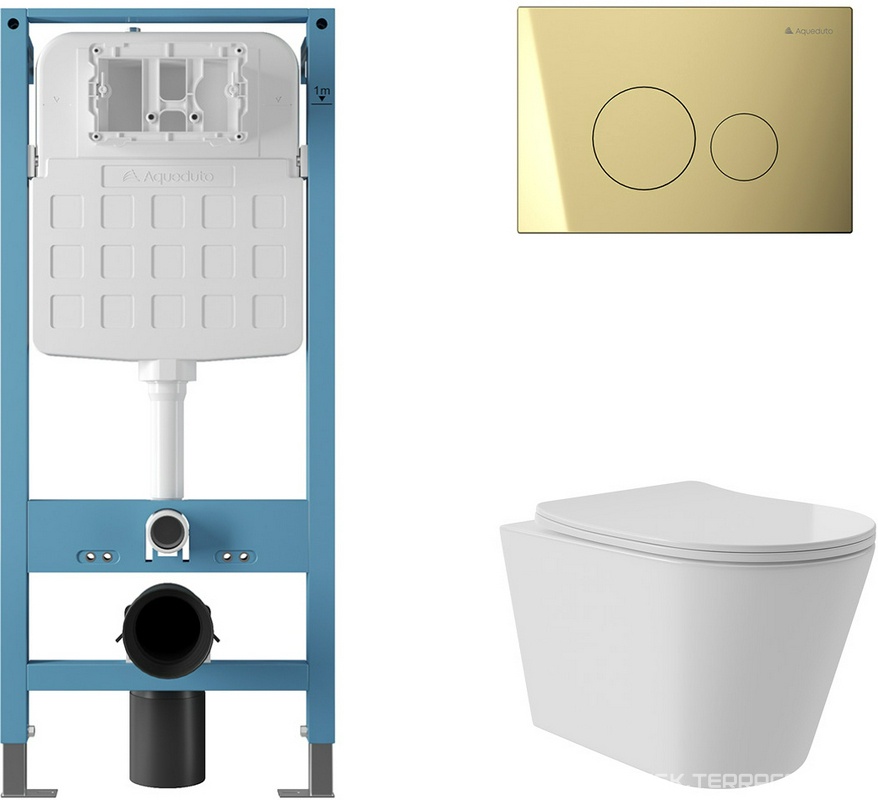 Компл.:унитаз подв.,безобод,Tornado 520х365мм,цв.белый гл,сиденье с микрол,инстал. д/унит,крепёж, клавиша смыв Circulo Novo цв.шл.золото, ZZ Aqueduto Cone Plus AQDS238T