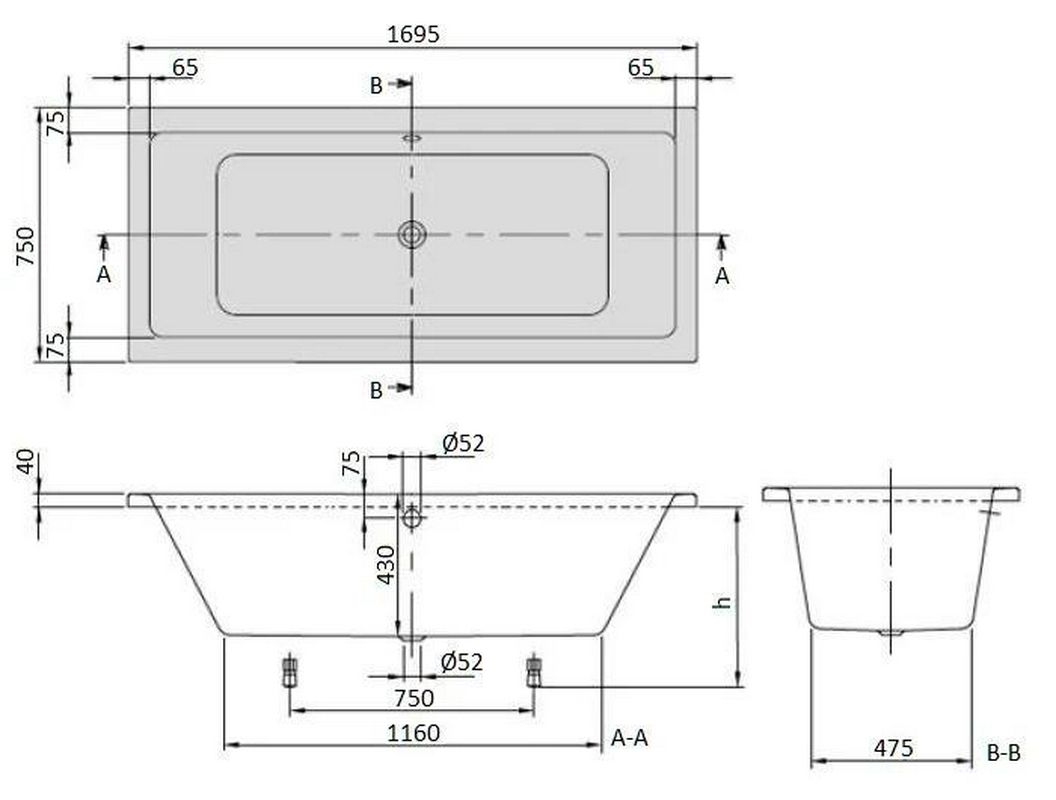 Ванна 1700x750xh580мм, пристенная, интегрированный слив-перелив, донный клапан цв.хром в компл., (акрил цв.белый), BelBagno ZZ BelBagno Универсал BB711-1700-750