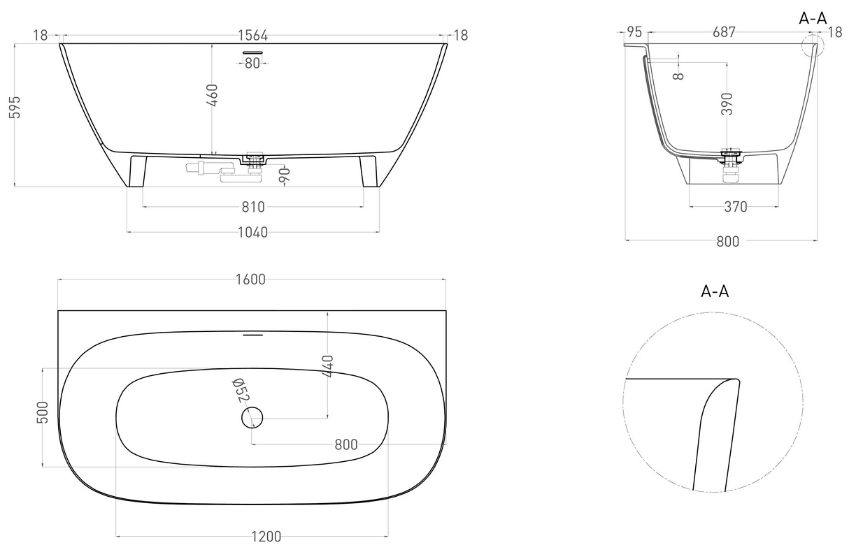 Ванна пристенная Salini Sofia Wall 180 Ванна 1600х800хh590мм, пристенная, литой камень S-Stone матов цв.белый, д/к Up&Down в цвет ванны, интегрир.слив-перелив,рама в компл,Sofia Wall 160 ZZ